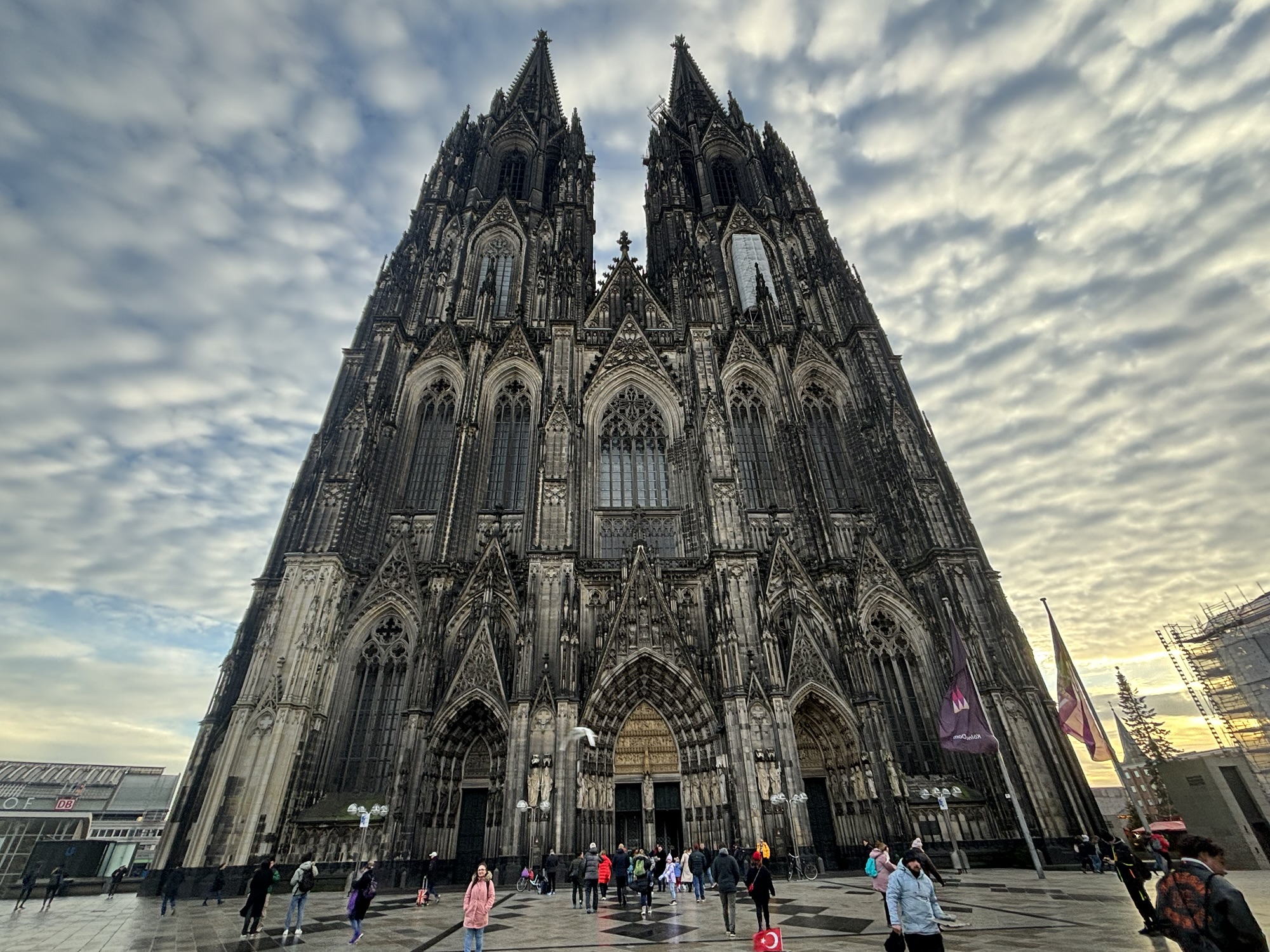 ケルン駅を出るとすぐケルン大聖堂があり、迫力に驚きました。また、眼下でクリスマスマーケットも行われています。