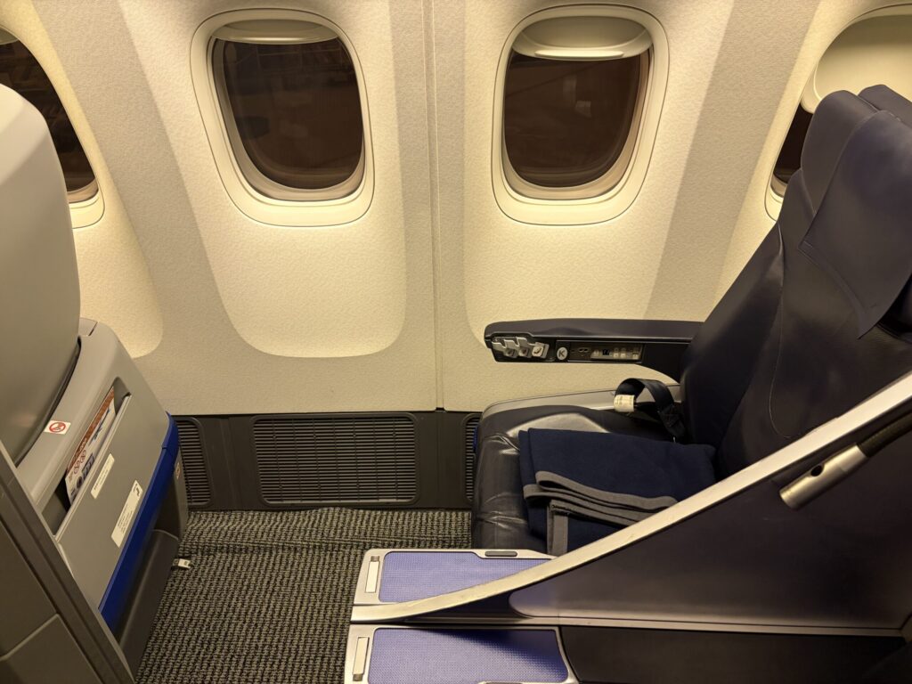 プレミアクラスの足元はゆったり。お席の横にType-AのUSBと電源がありました。